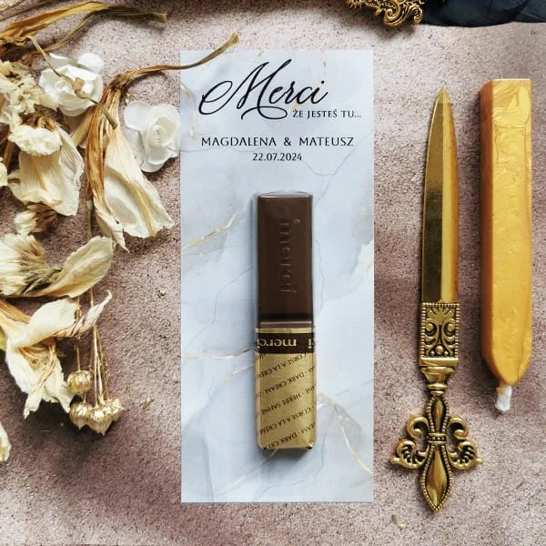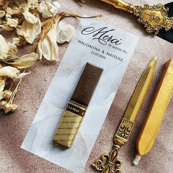 Upominki dla gości weselnych w formie karteczki z czekoladką to świetne rozwiązanie, aby podziękować swoim gościom za przybycie.
