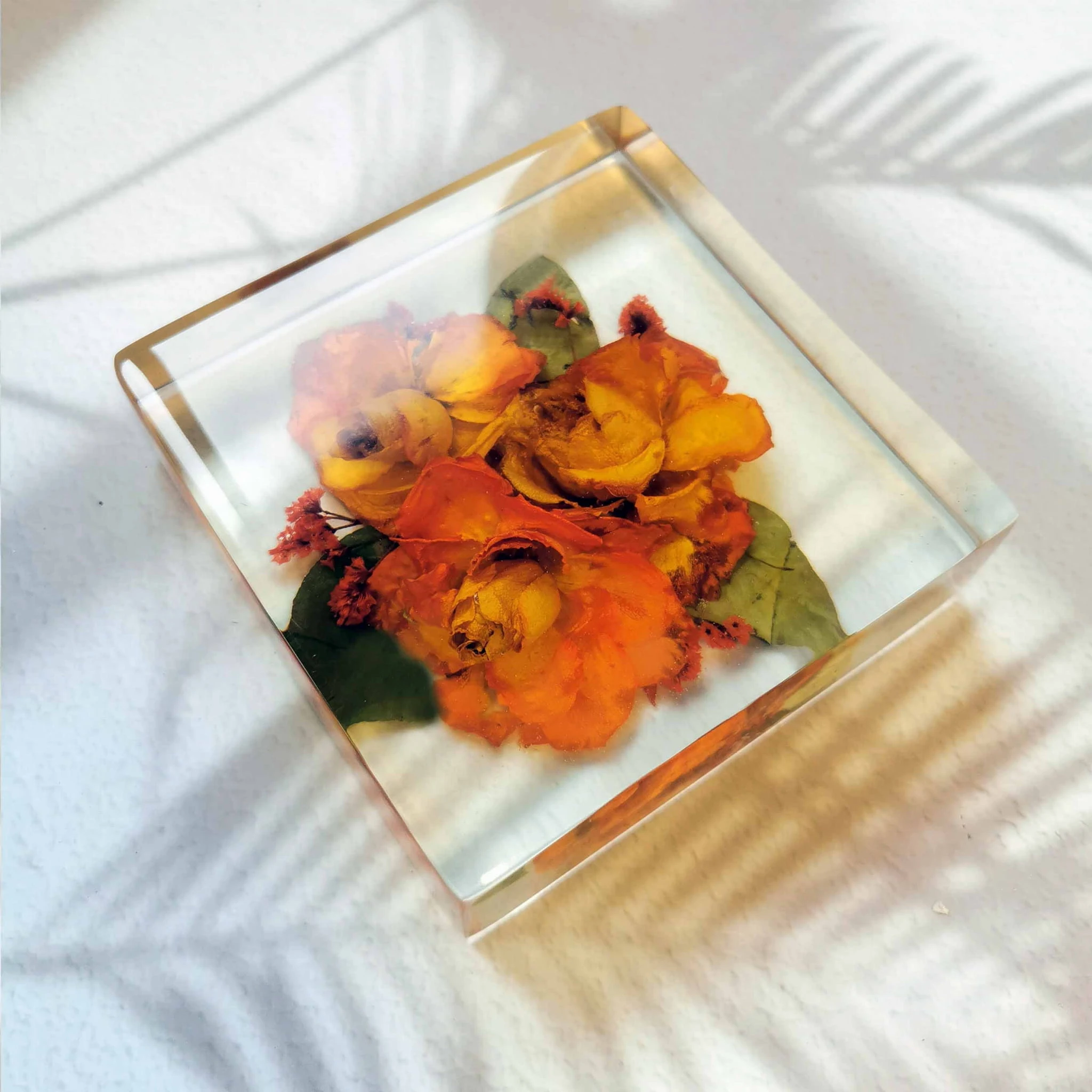 Bukiet ślubny zatopiony w żywicy w kształcie kwadratu